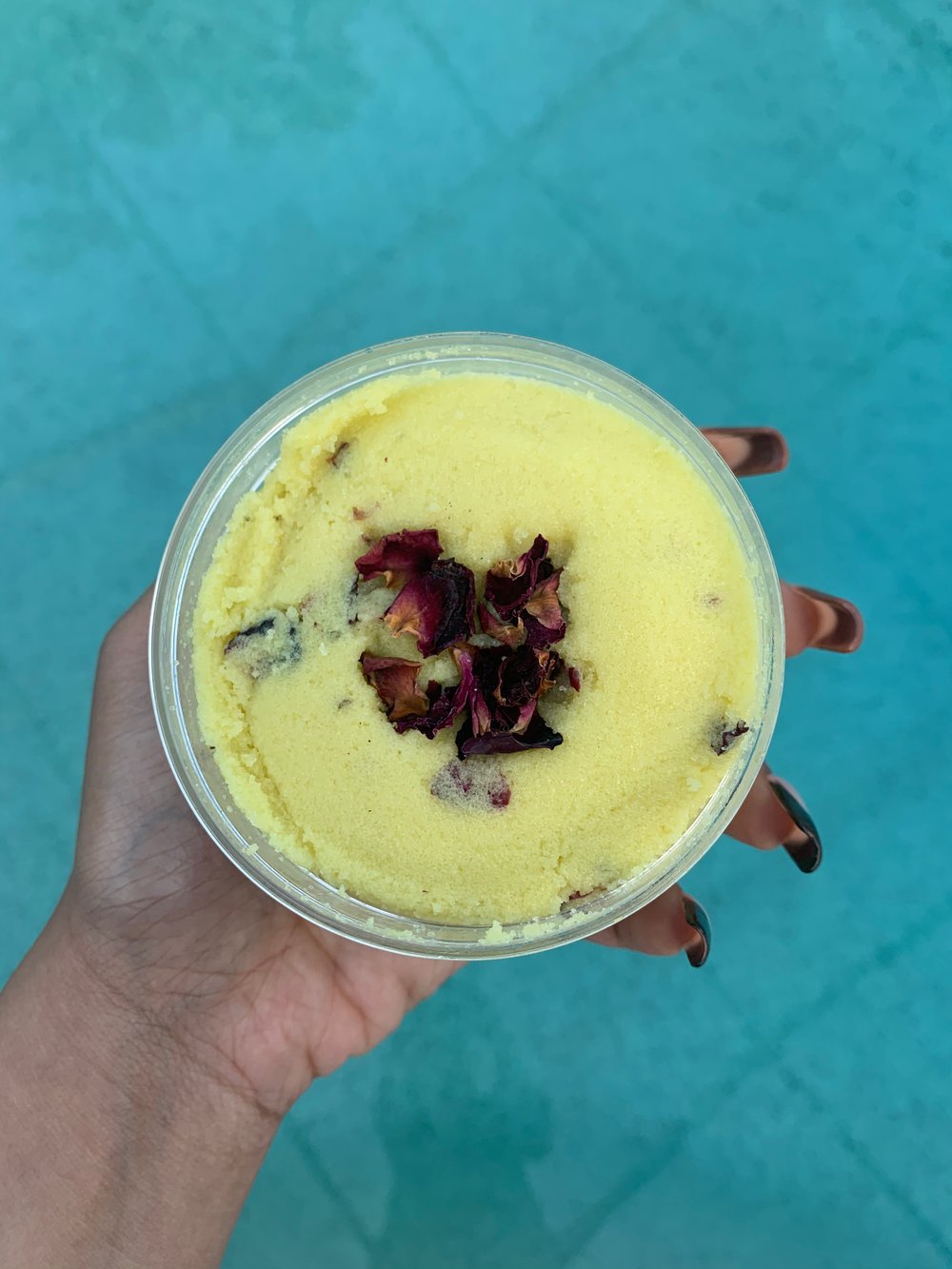 Ingredients: Ingredients: sugar, unrefined Shea butter, Raw mango butter, coconut oil, rose buds, propylene glyco, artificial flavor, alcohol, water, triacetin, Phenonip, safflower seed oil, caprylic capric triglyceride, apricot kernel oil, jojoba oil, vitamin e, fragrance, soybean oil
